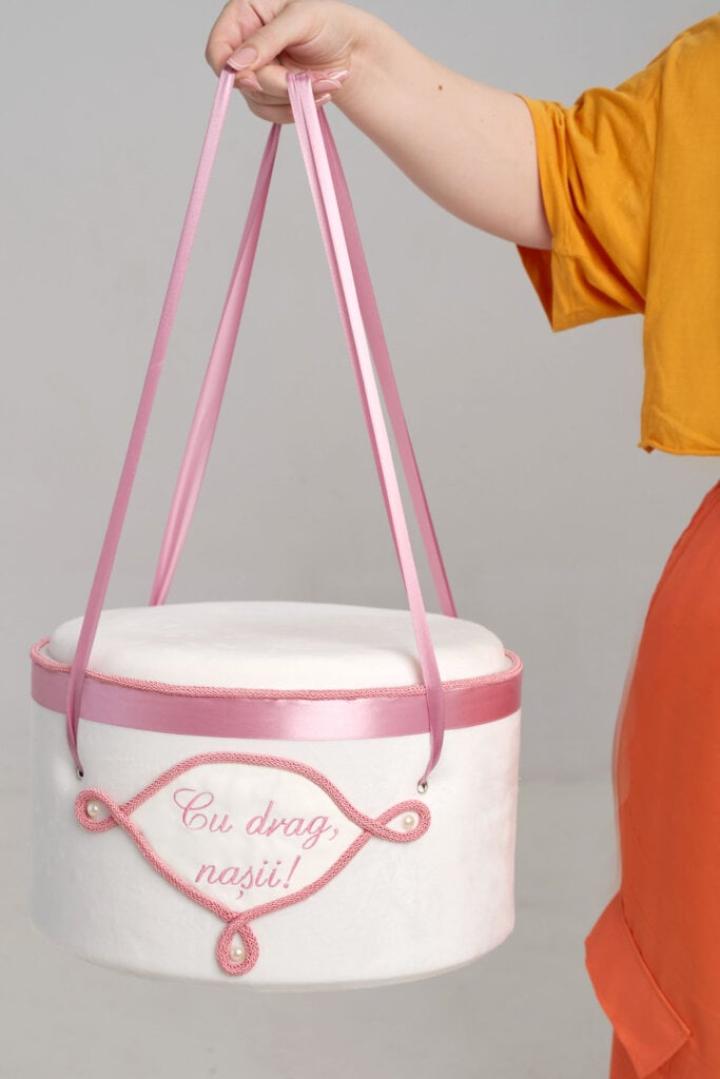 Decorul discret - panglici satinate si snur impletit in tonuri placute - adauga o nota de gingasie fara a incarca vizual.