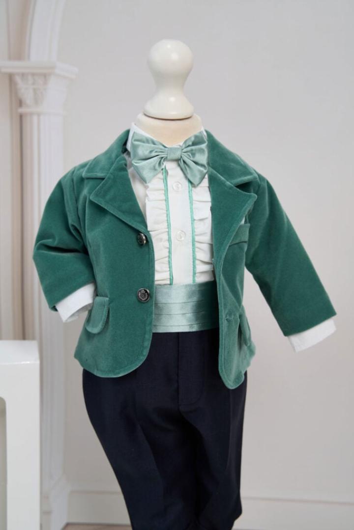Costumul de botez contine 5 piese: pantaloni (stofa), brau (satin), sacou (catifea), camasa (bumbac), papion.