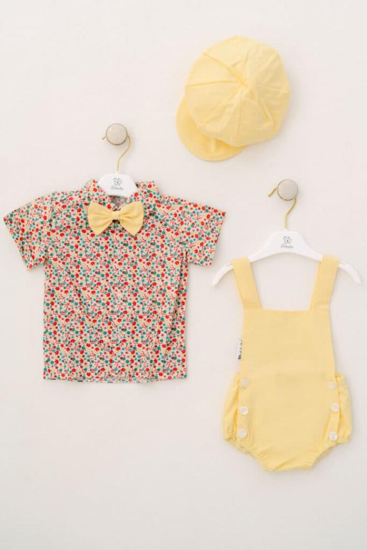 Costumul de botez contine 4 piese: pantalonas tip salopeta cu bretele, camasa, papion, sepcuta.